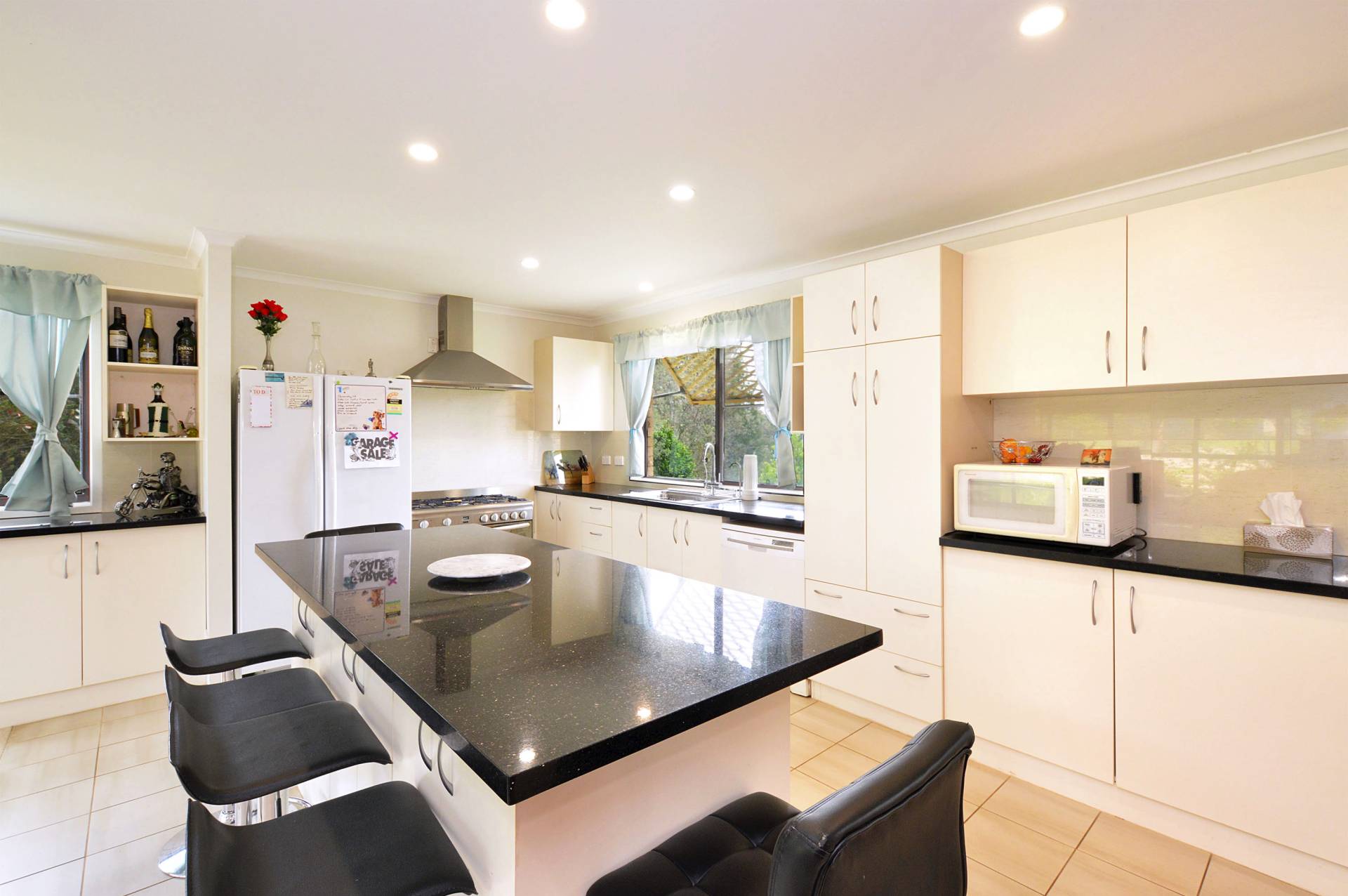 House: Brick and tile, three bedrooms, one bathroom with extra toilet, open plan living/dining/lounge room, modern kitchen with granite bench tops, walk in pantry, huge enclosed sun room, slow combustion fire, reverse cycle a/c, and Bose surround sound system. The kitchen was recently renovated with 900mm freestanding stove with electric oven, trough style sink and porcelain tiled floor.