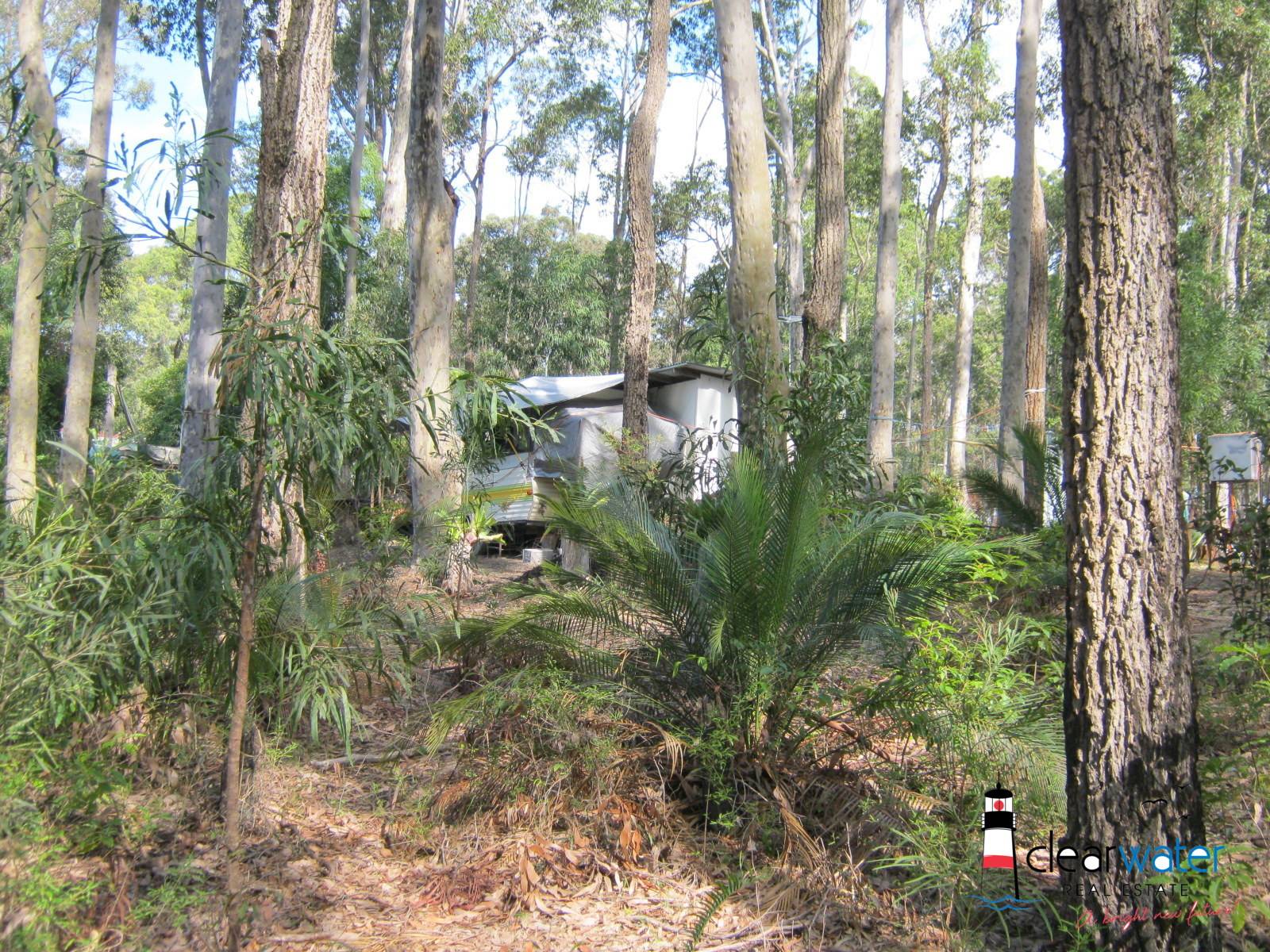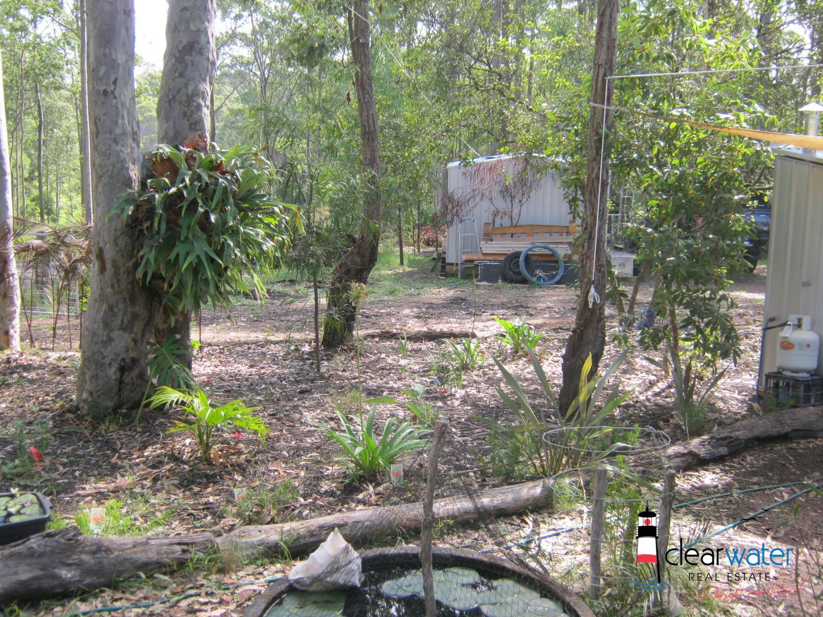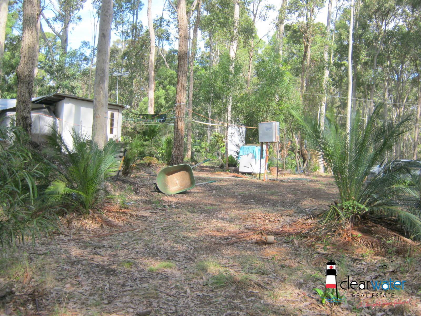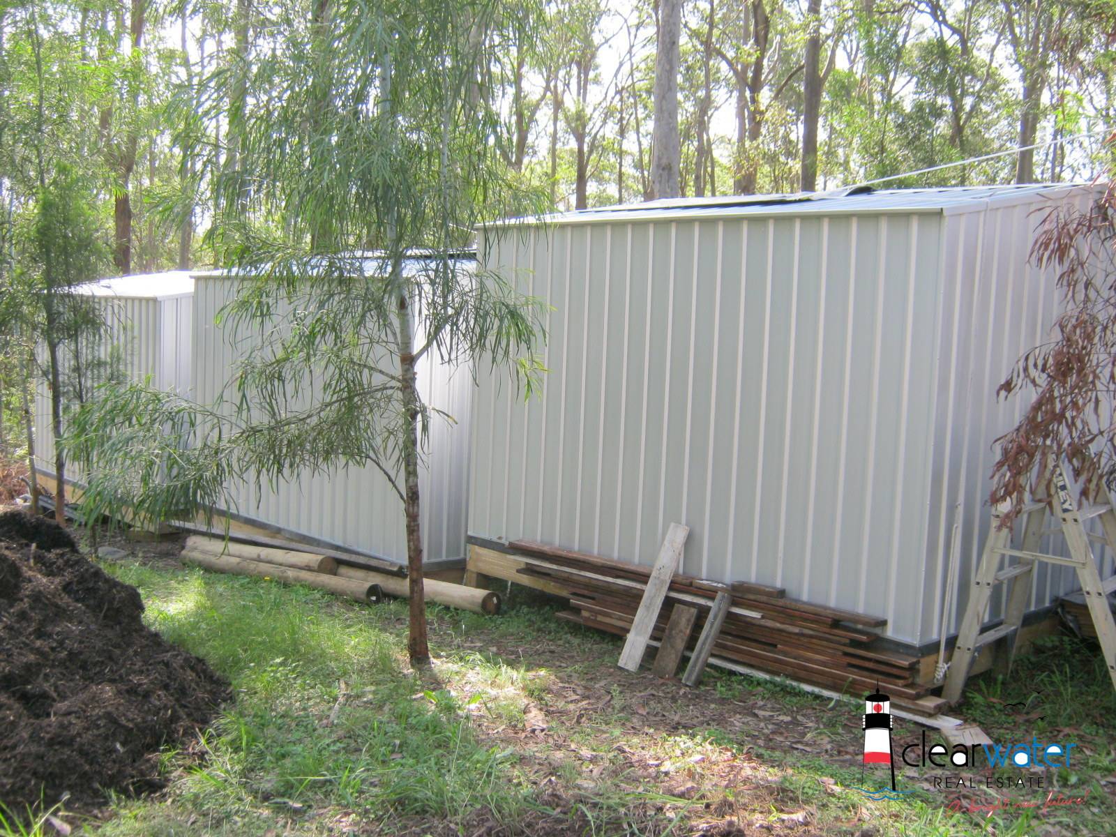 Features include: three good sized storage sheds, one smaller garden shed, near level home site, plans for a two bedroom home, older style caravan and annex.