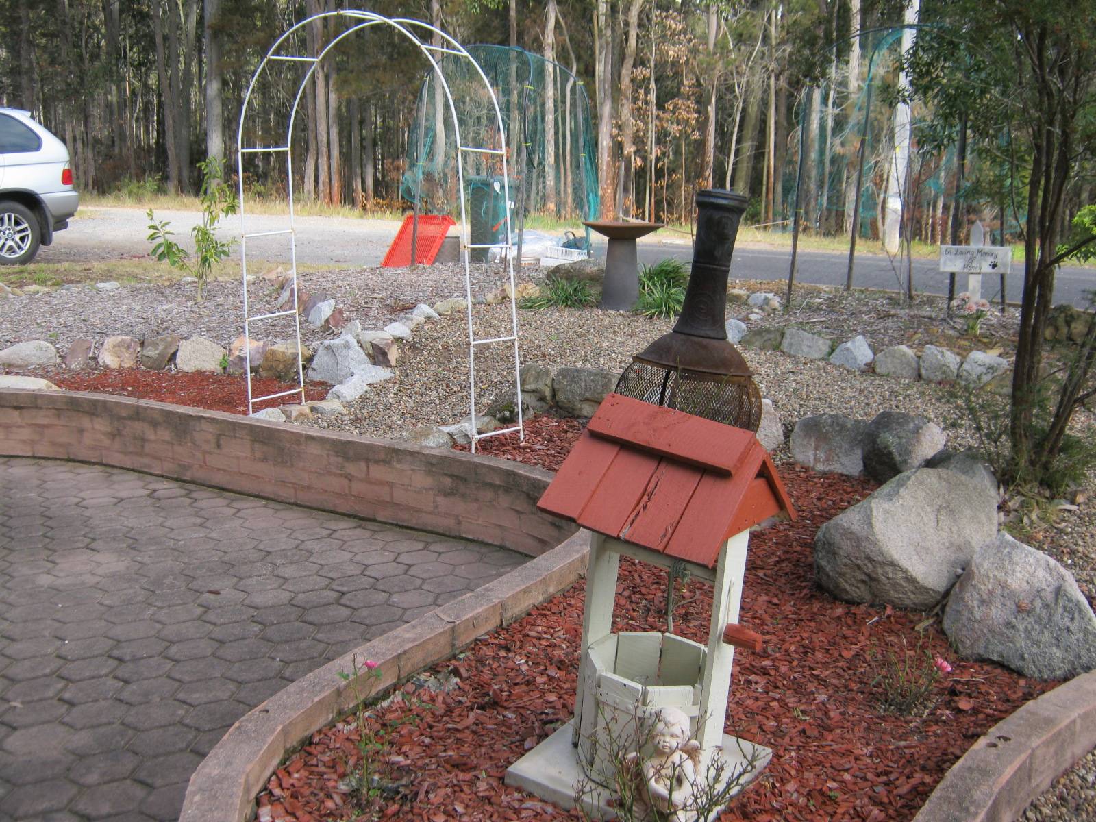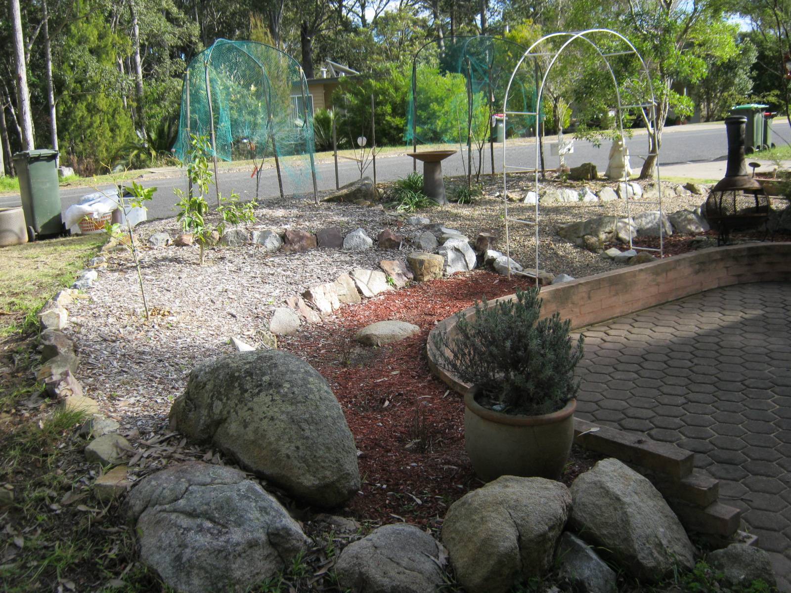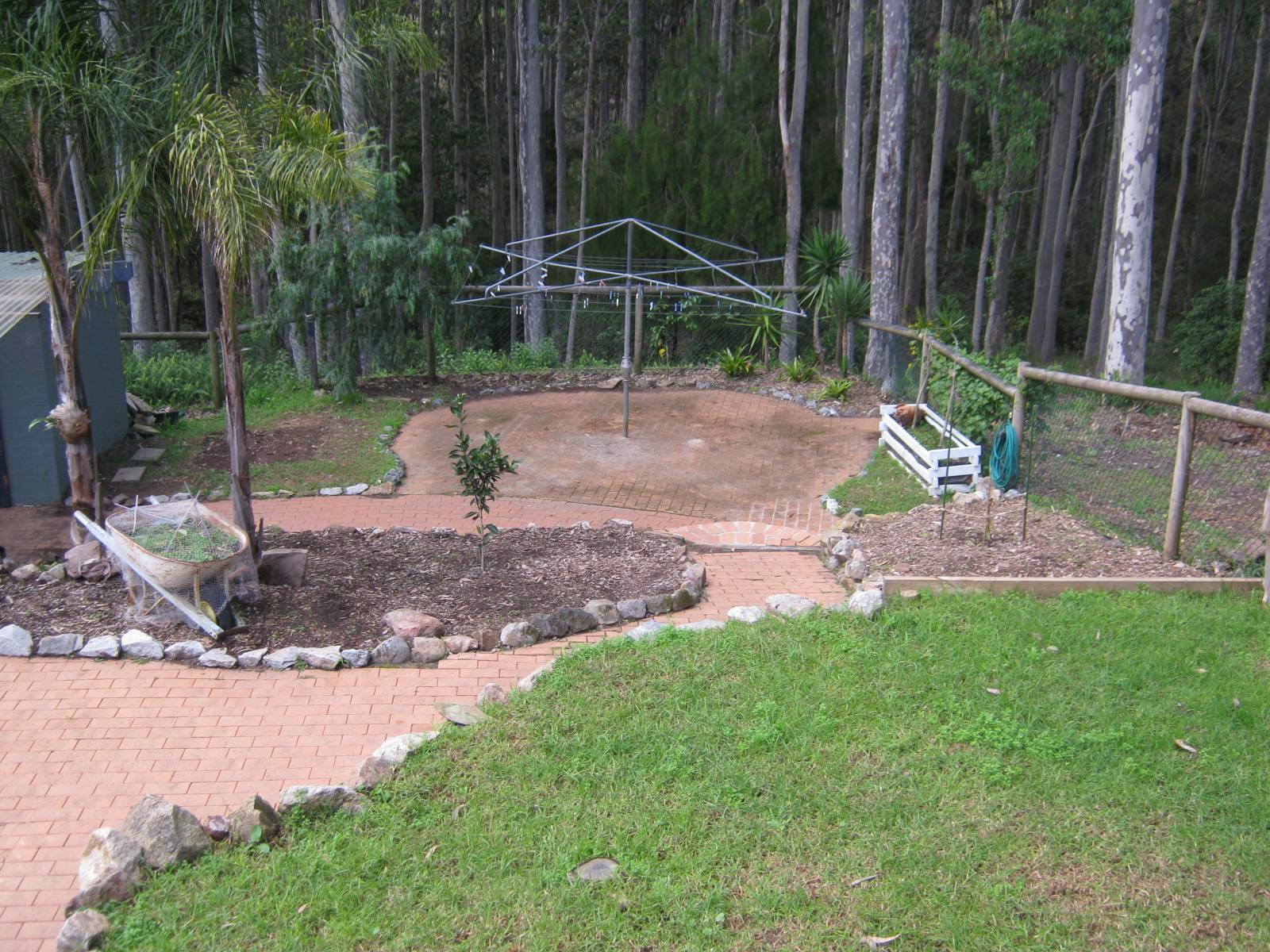 Outside: Minimal lawns, terraced and paved with small gardens.