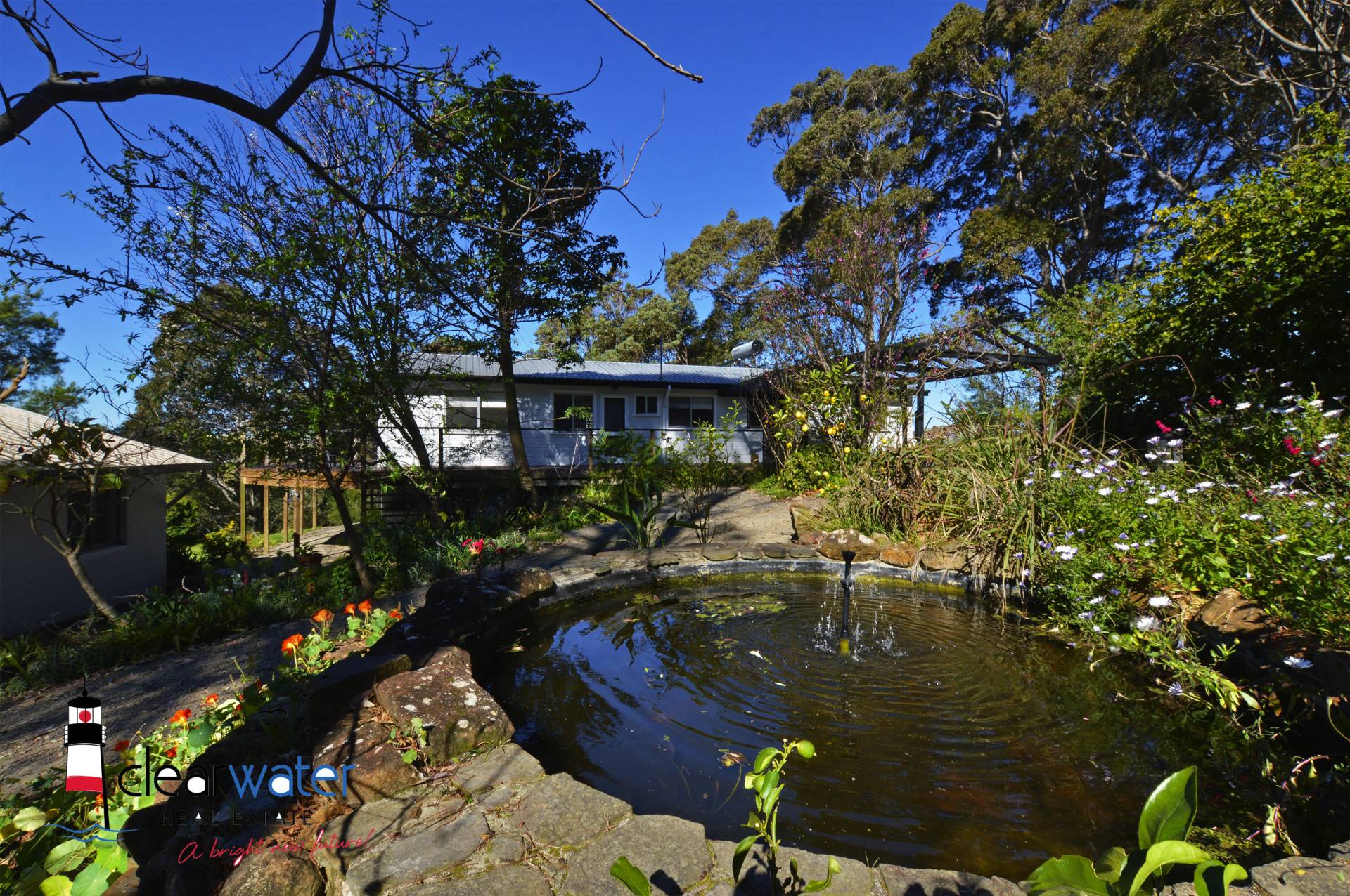 Outside - Main House: Landscaped gardens, fish pond, vegetable patch, orchard with a huge number of fruit, citrus and olive trees. The grey water is recycled and used as irrigation which keeps the property looking green and lush.