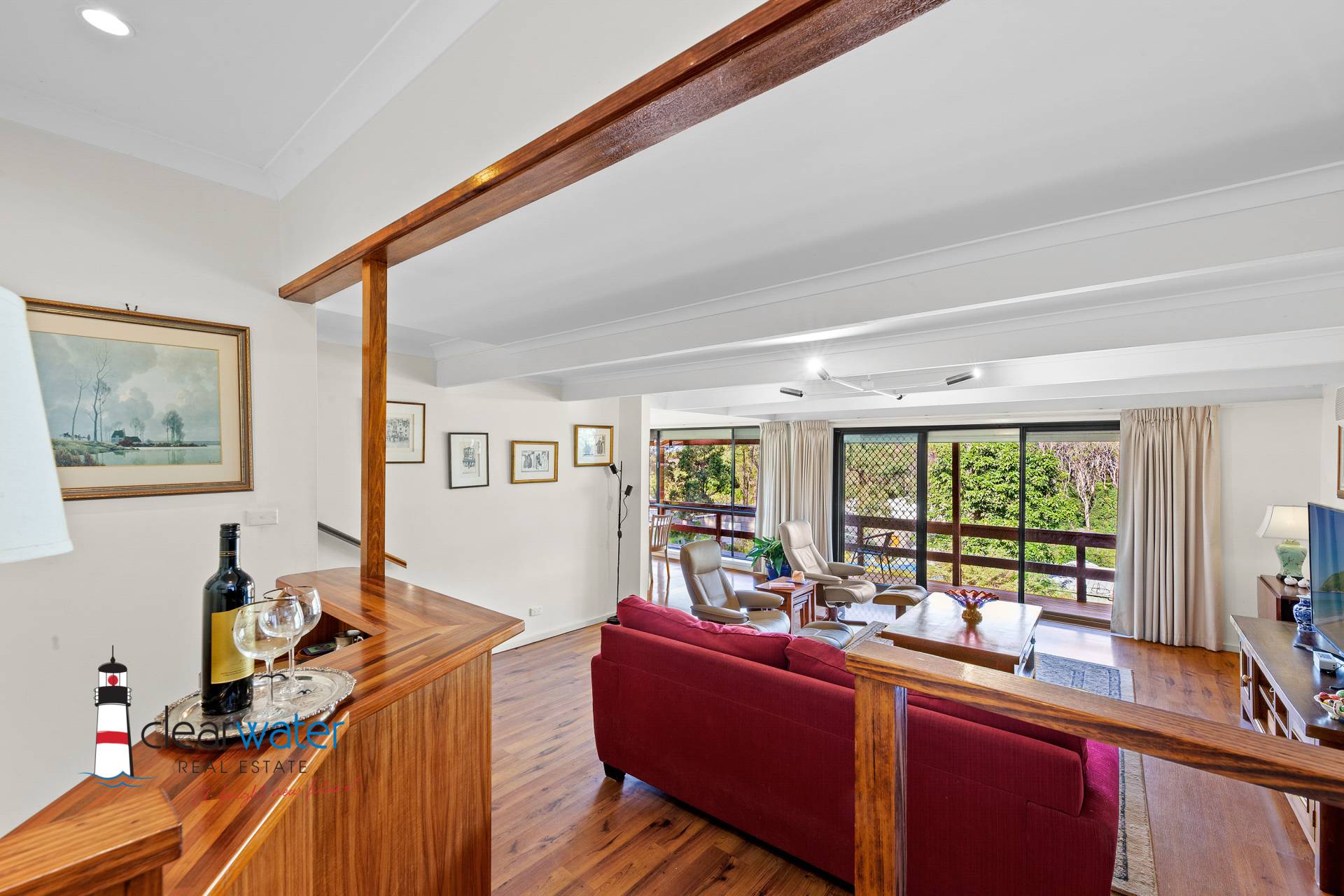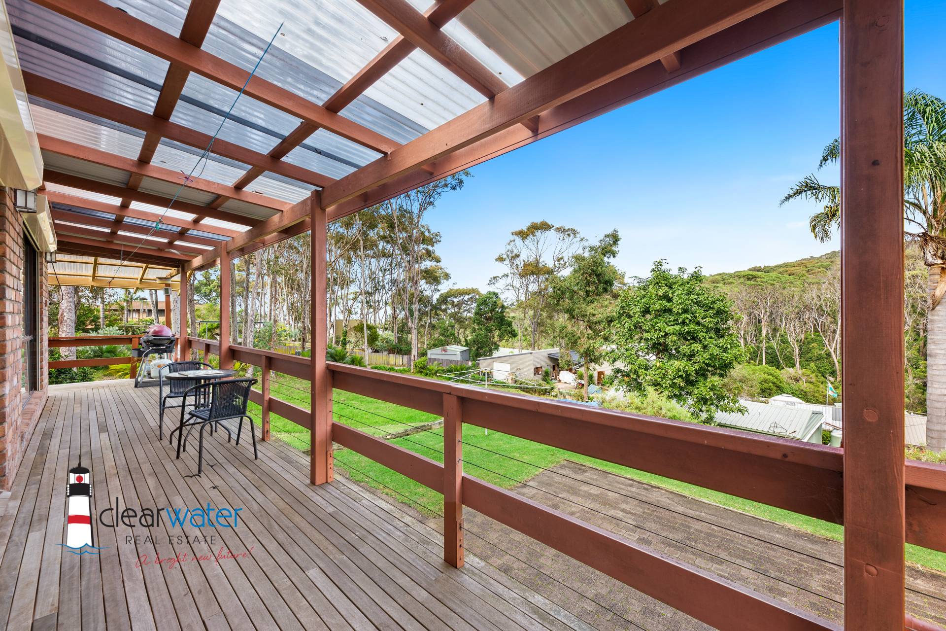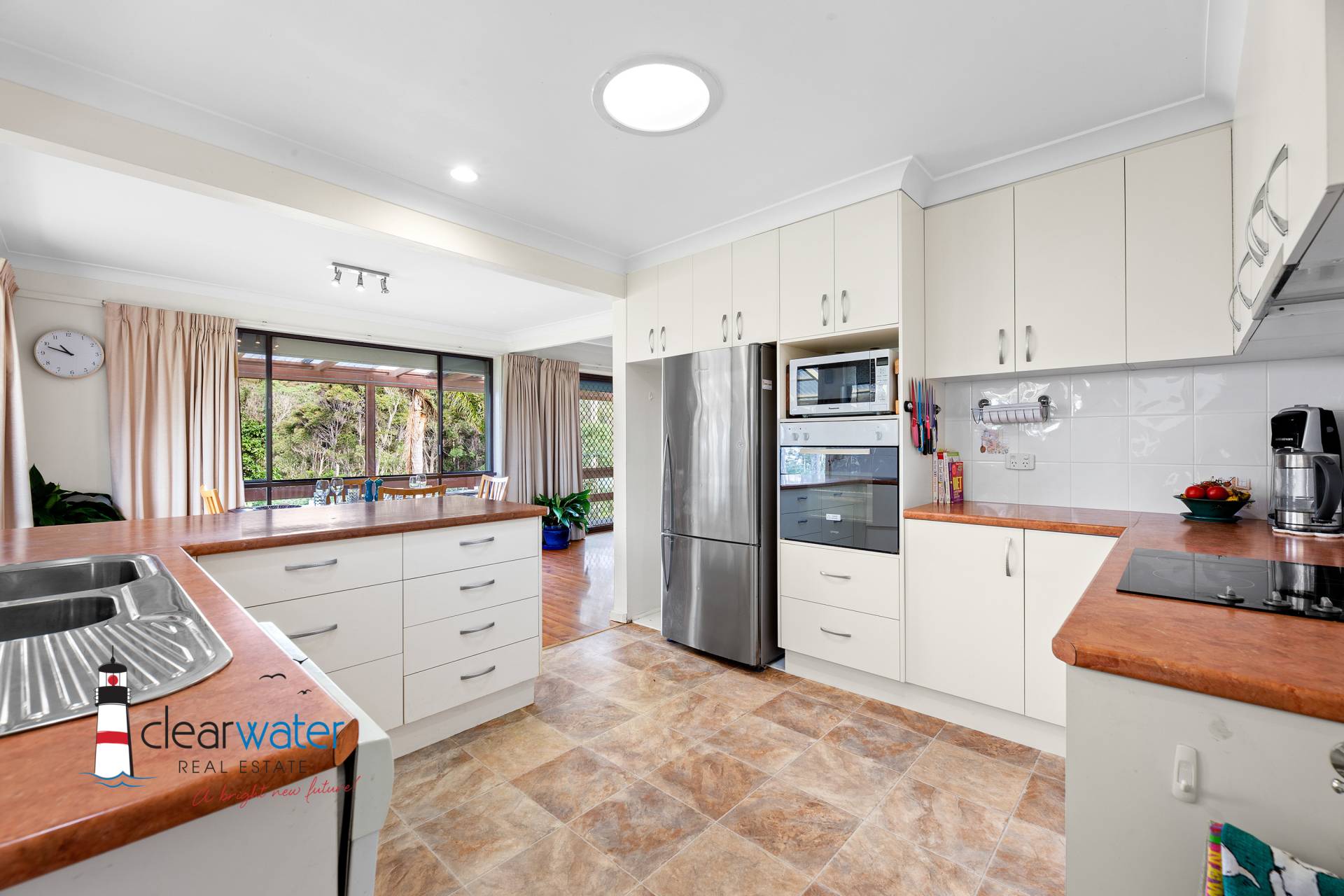 The kitchen has a breakfast bar, pull out pantries, lots of bench space, dishwasher and provides a functional place where any cook would be happy. The home has open plan dining and lounge room with sliding doors opening onto the covered deck. Entertain inside around the bar or venture outside, to listen to the waves and all the bird life while you enjoy the view of the surrounding bushland and beach. There are nice, grassed areas for the kids and pets with lovely gardens displaying colour all year round.