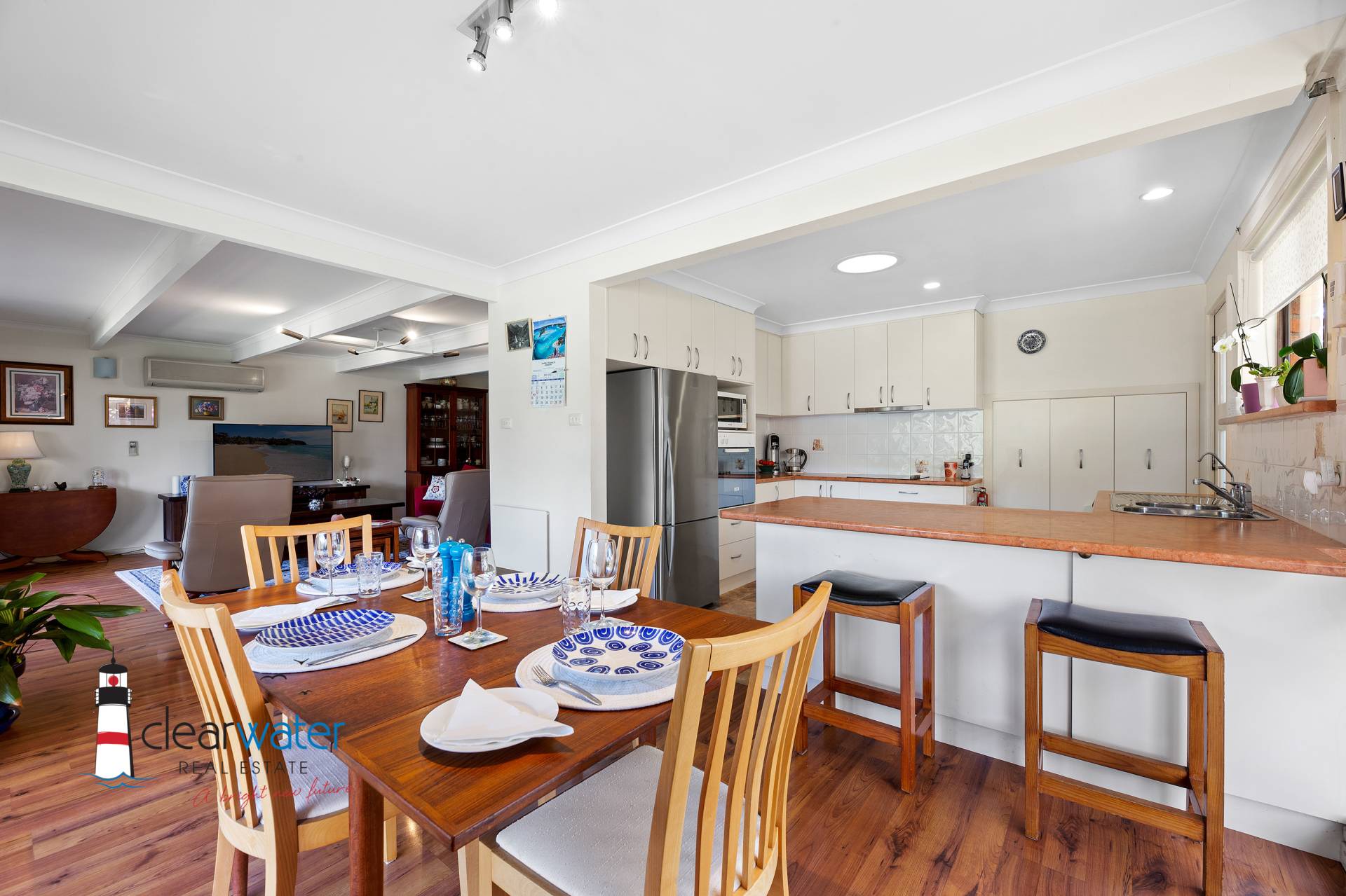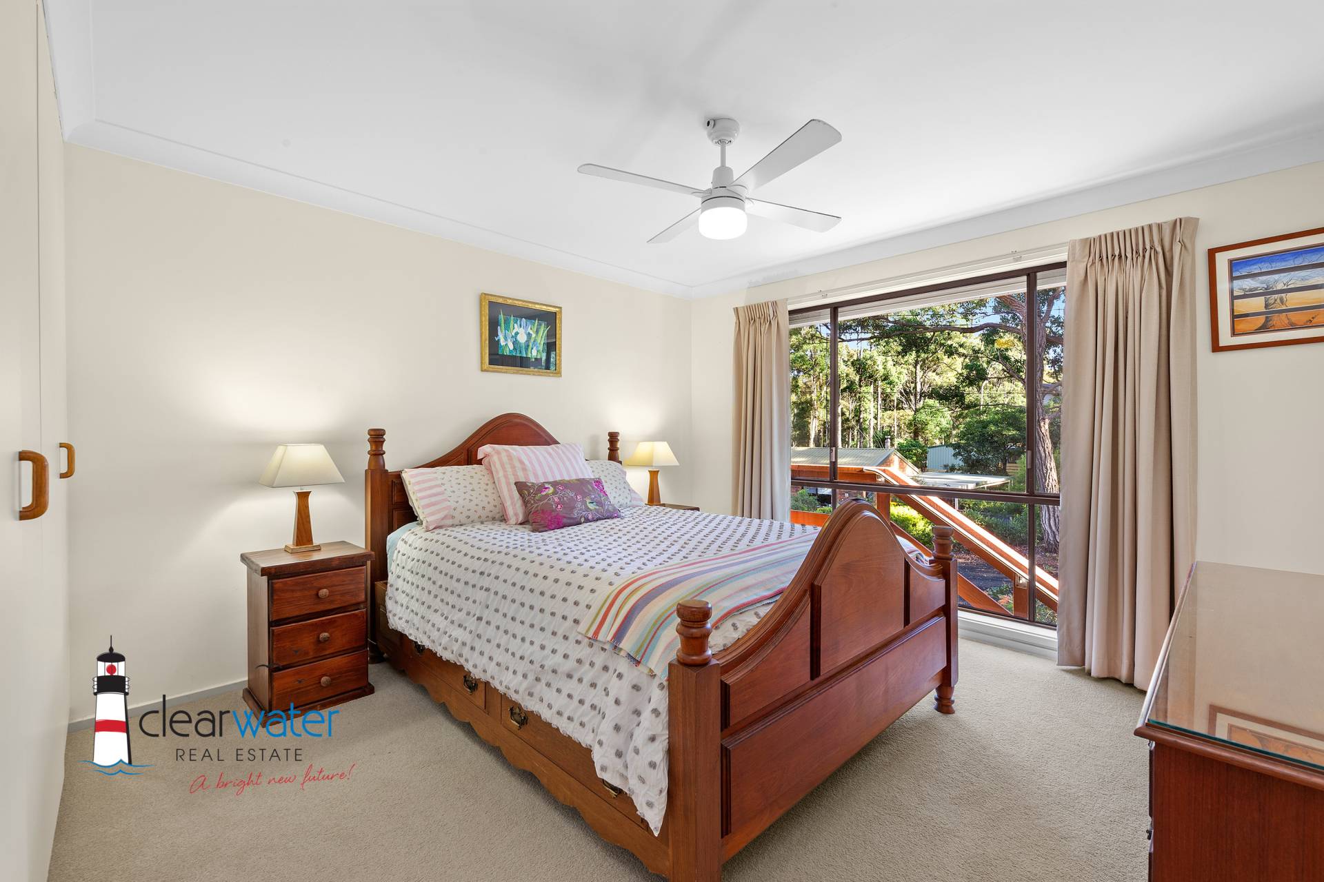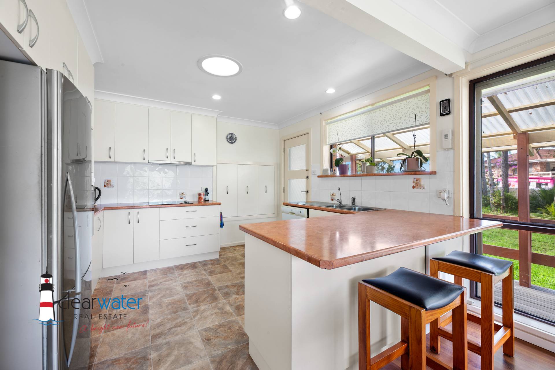 The kitchen has a breakfast bar, pull out pantries, lots of bench space, dishwasher and provides a functional place where any cook would be happy. The home has open plan dining and lounge room with sliding doors opening onto the covered deck. Entertain inside around the bar or venture outside, to listen to the waves and all the bird life while you enjoy the view of the surrounding bushland and beach. There are nice, grassed areas for the kids and pets with lovely gardens displaying colour all year round.