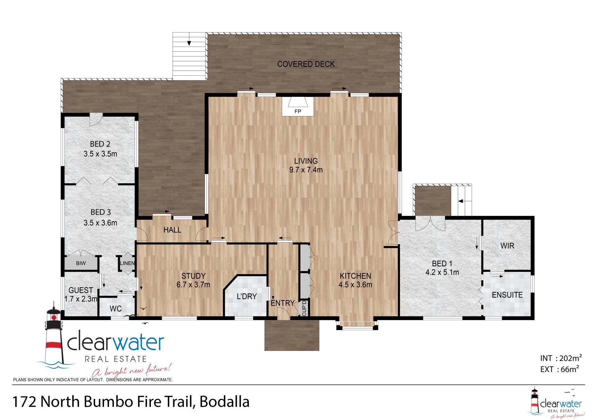Features: Open plan living area with hardwood floors, high ceiling, county kitchen, wood heater and easy access onto the large front covered deck. The home has been designed to have separation with the master bedroom on one side with its own entry, ensuite and walk in robe. Potentially could be used as a B & B (subject to council approval). On the other side, the two bedrooms have a dividing wall that can be opened up when not required. The guest bathroom has a separate toilet and bathroom. This side of the home can be closed off at the hallway for more privacy. The large study could be used as a second living area to be utilised by bedrooms two and three. The large deck is ideal for entertaining or just sitting and relaxing while admiring the lovely scenic views over the creek.