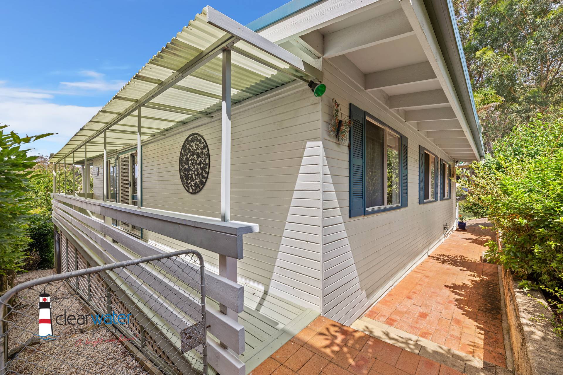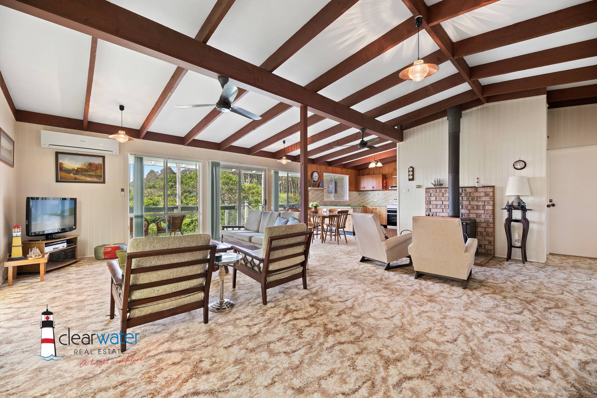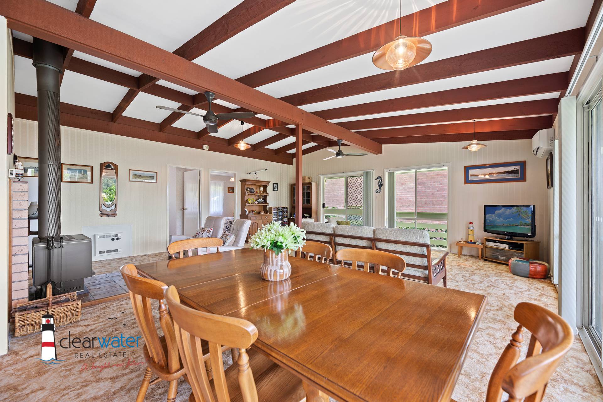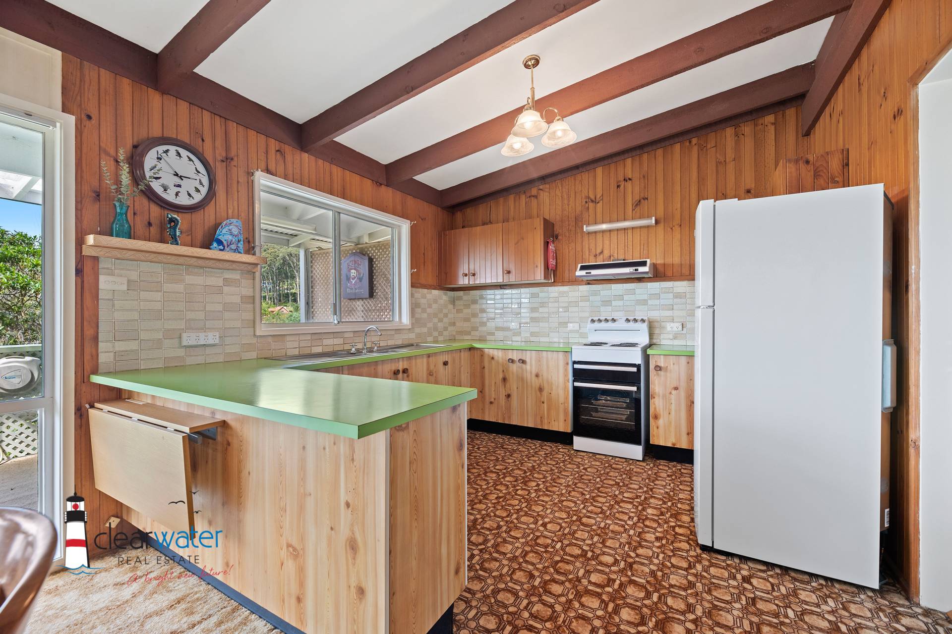 Upstairs: Open plan layout with cathedral ceilings to give you a sense of space and light. There is a slow combustion wood heater, reverse cycle air conditioner, easy access to the full length rear deck and a glimpse of the inlet. The kitchen is straight from the 70's, with its bright green laminex bench tops and light timber doors, all of which are in very good condition. Three good sized bedrooms, all with built in robes, and a central bathroom. Next to the kitchen is where the original laundry used to be (plumbing still in place). This could easily be converted back to a laundry, a butler’s pantry with sink or a large pantry/storage area for all your cooking appliances. The spacious covered rear deck runs the full length of the home and is great for entertaining family and friends.