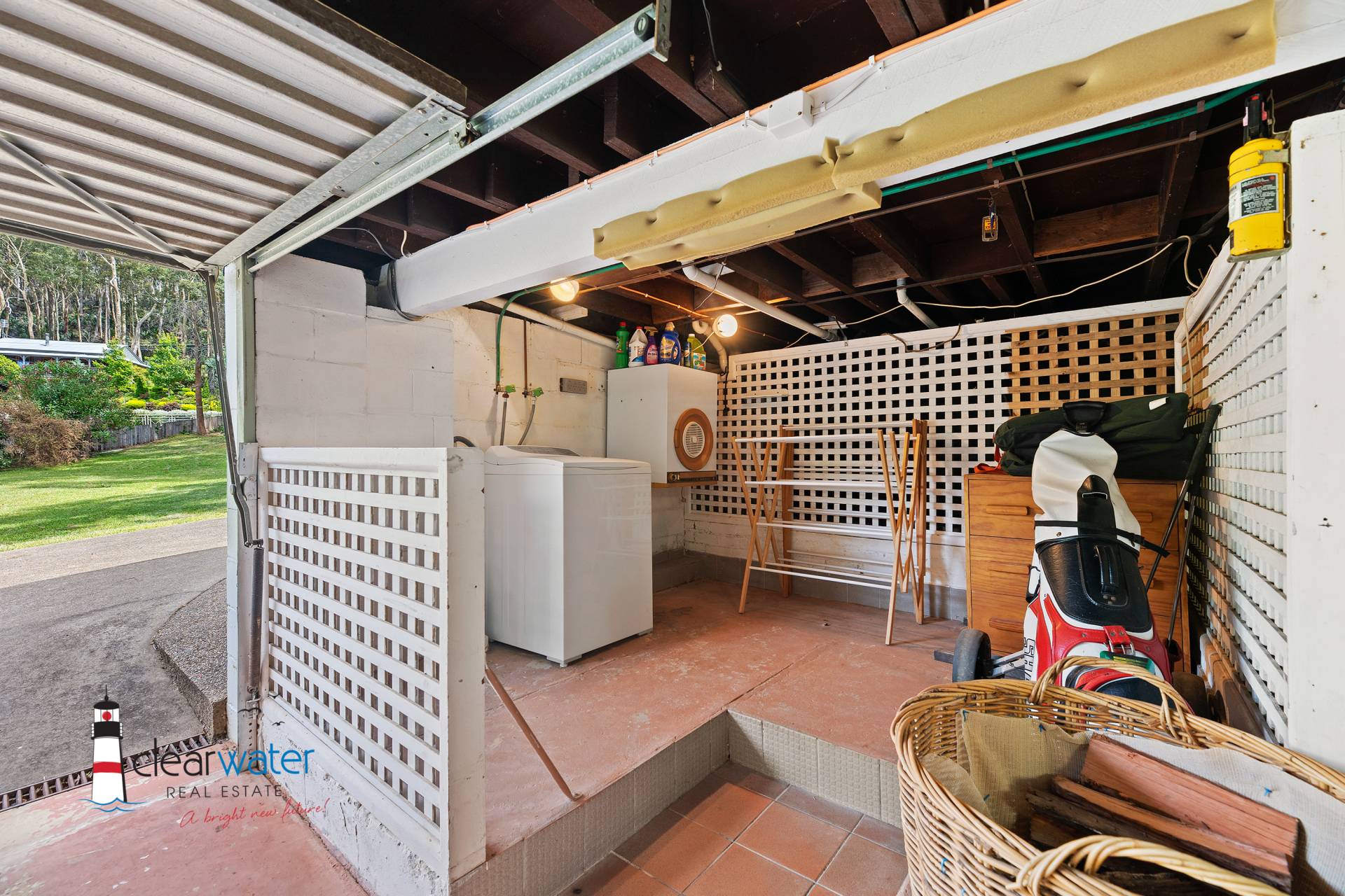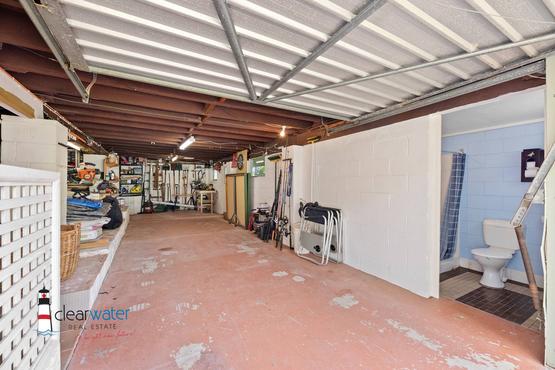 Downstairs: Parking for one small to medium car, huge workshop area, plenty of storage space and a  laundry area. There is a shower and toilet located just inside the door which is very practical if gardening or returning from the beach. The concrete driveway has space to park an extra car, boat, trailer or small caravan.