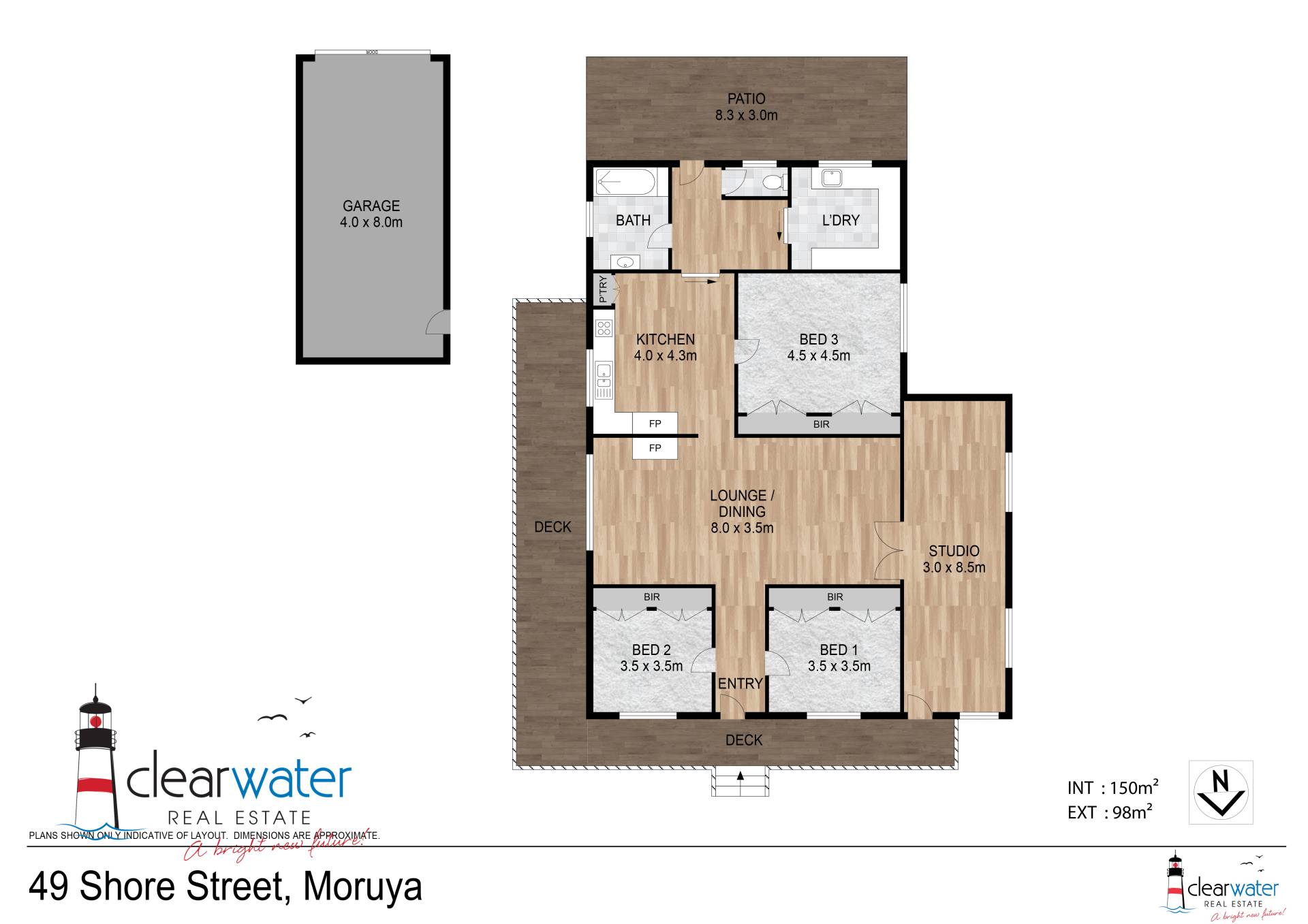 Features: A single level brick clad home, three good sized bedrooms, kitchen, spacious lounge/dining area, central bathroom, front and back verandas. Off the lounge  room is a bedsit with its own access to the rear deck, ideal as an office or extra visitor accommodation. There is a lock up garage with power.