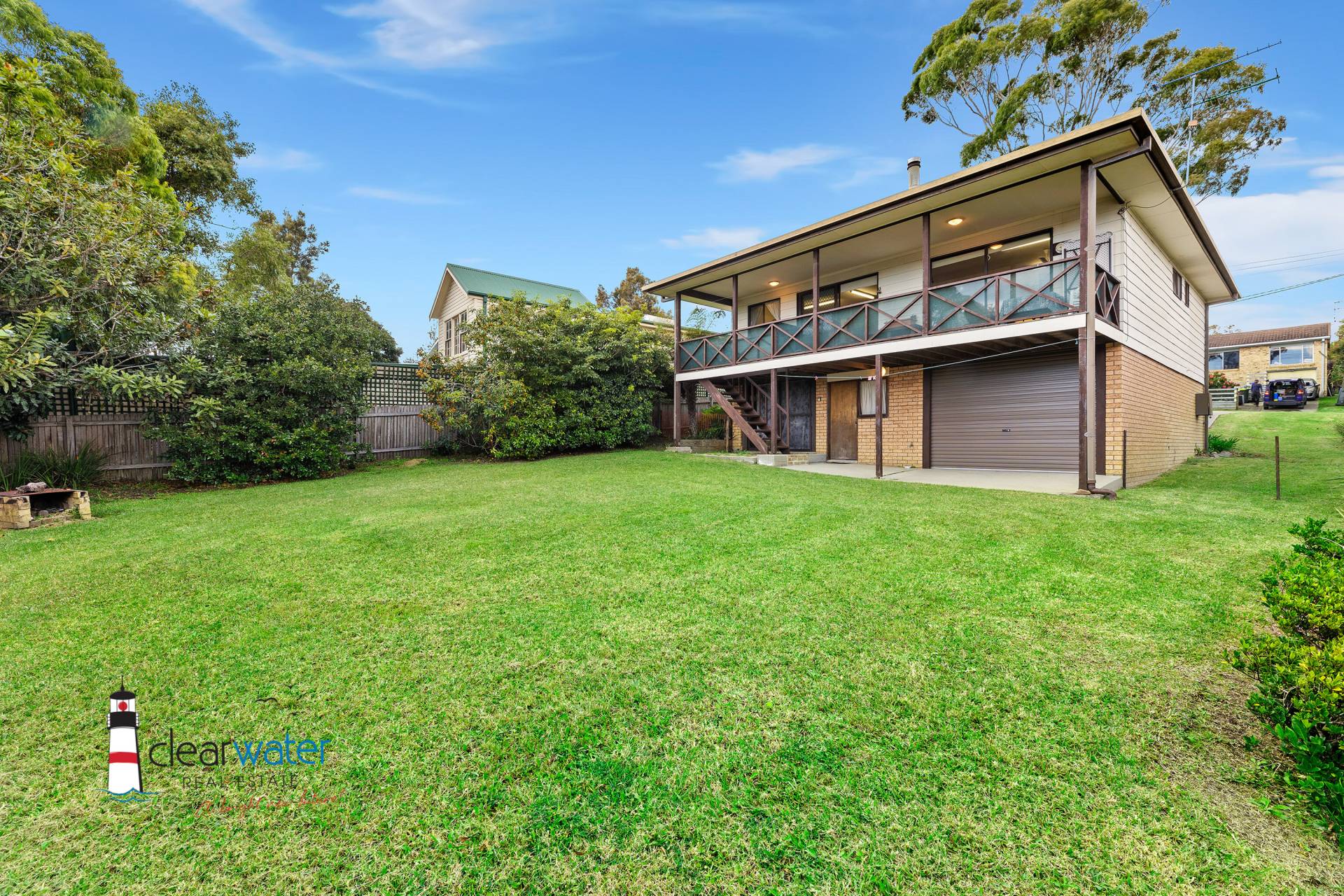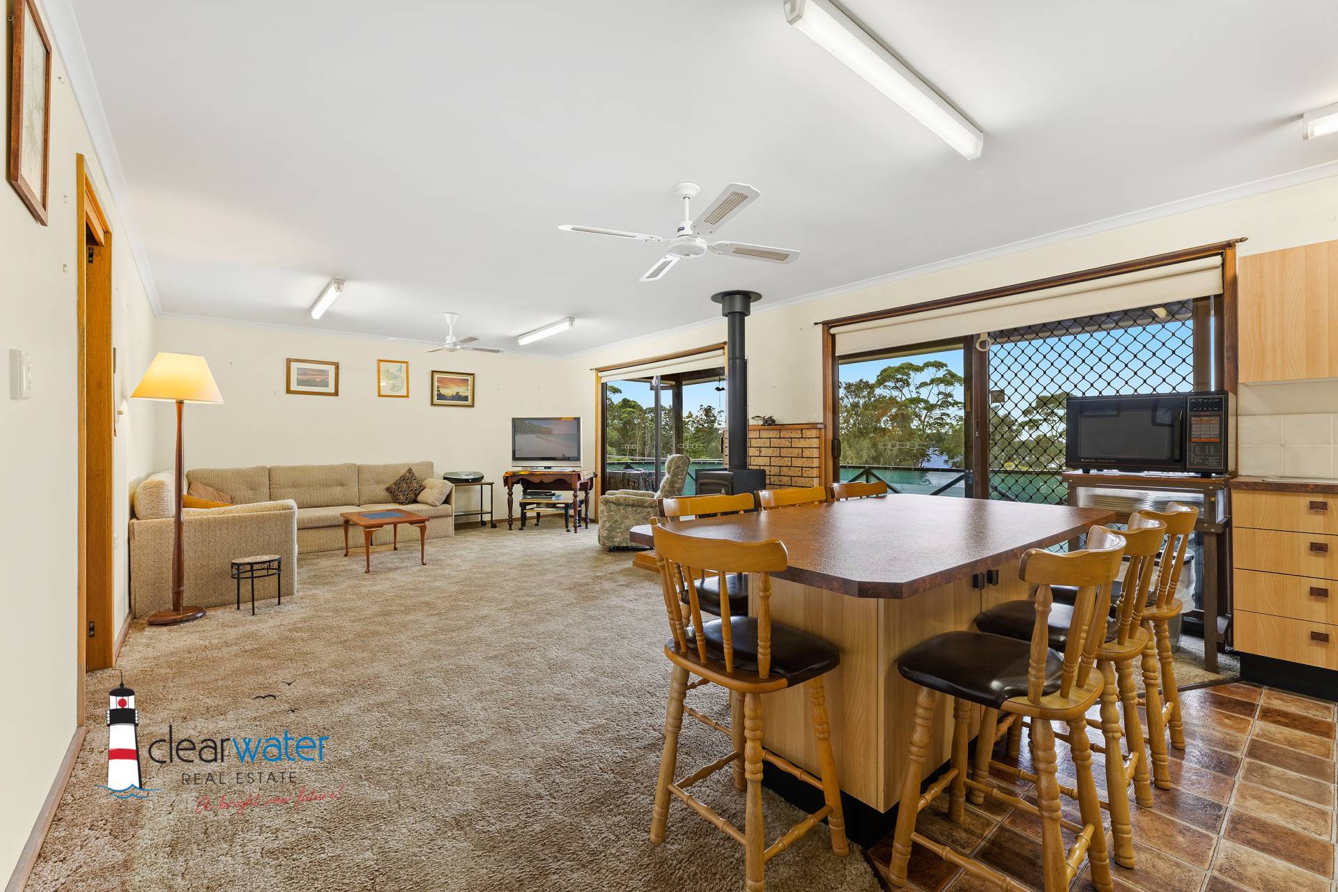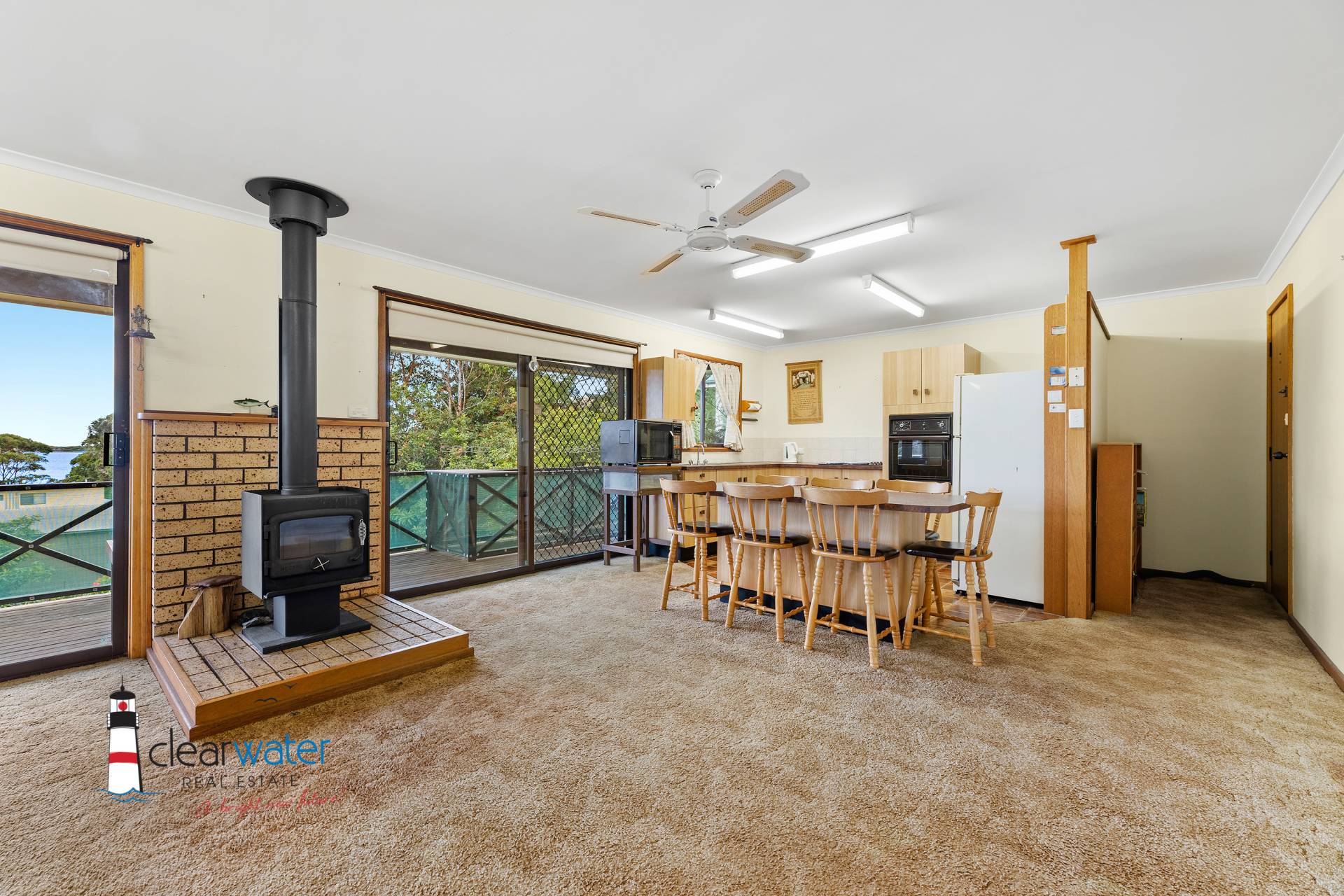 Upstairs: Three bedrooms, central bathroom, separate toilet, slow combustion wood heater in the combined lounge dining area which allows for a secondary entry from the rear deck that overlooks Coila Lake.